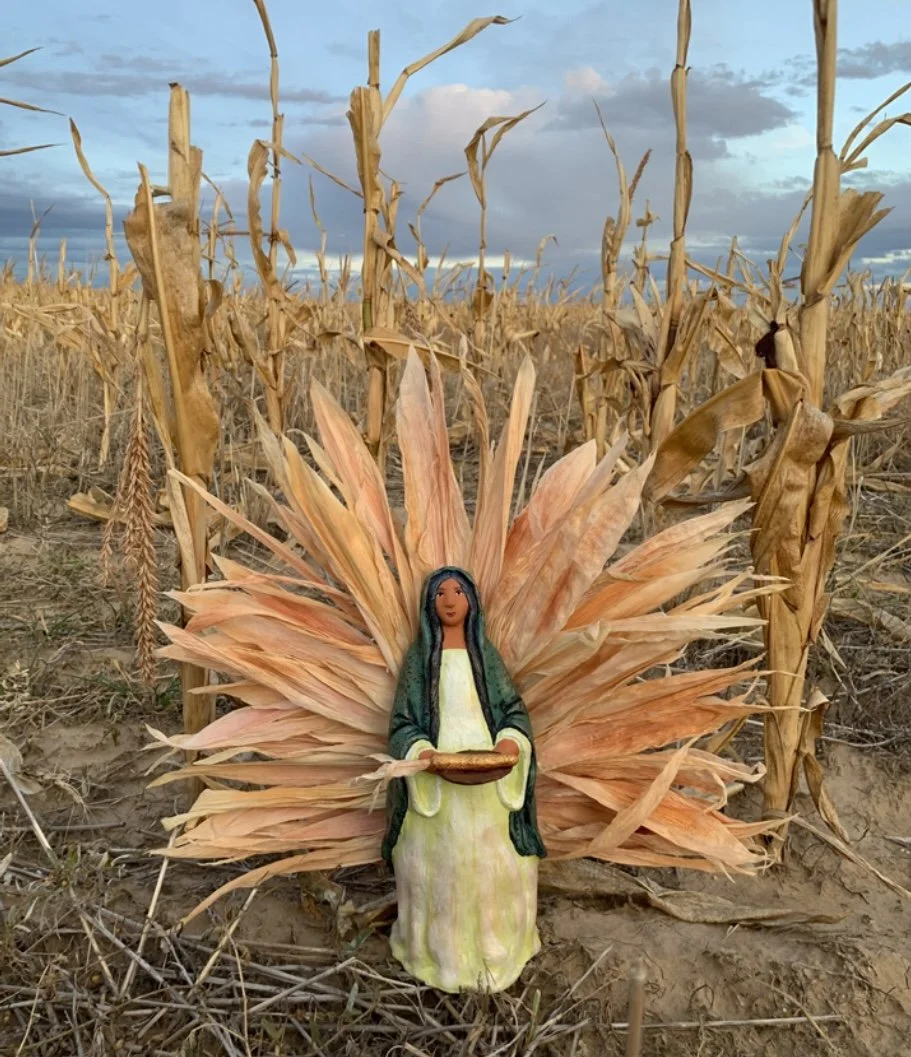 So that’s how I kind of got to the expressions of Madre Maiz as kind of a combination of these universal archetypes of the mother that shows itself in Catholicism with La Virgen, Maria, and the life-giving plantcestor that is corn. That is universal throughout the most northern to the most southern parts of what we know as the Americas– and kind of giving it a new face, which isn’t really new, it’s just recycled. I find myself yearning a lot for the things that were burned and destroyed. That does then create an impulse to create. It’s a process to go about with a lot of humility because it doesn’t change the reality. Even though I feel it’s my right to have access, I don’t want to feel like I’m indebted.